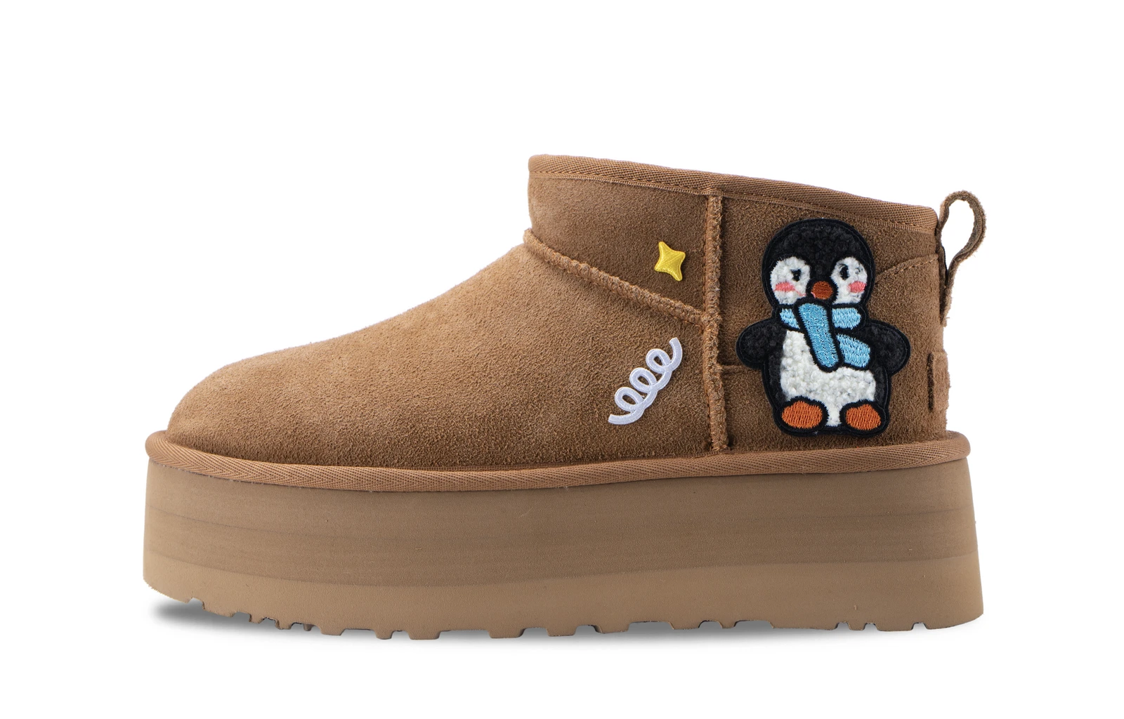该定制鞋选用原鞋款为UGG,货号为1135092-CHE。此鞋灵感来源于栗色,所以取名为冬日暖阳,加上小饰品的点缀,简约而不简单。定制鞋可以正常穿洗,穿着过程中尽量避免剧烈运动以及尖锐的物体划伤,请避免用高浓度有机溶剂擦洗,清洗时建议使用柔软的毛刷配合浓度适宜的清洗剂轻轻刷洗。本鞋手工绘制,实物与图片颜色会存在细微差别。